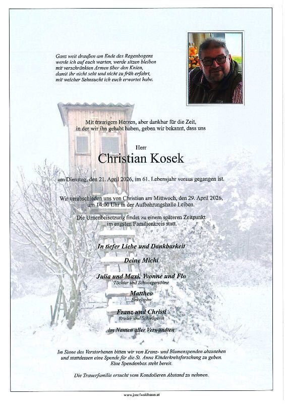 In tiefer Trauer gibt die Freiwillige Feuerwehr Leiben bekannt, dass unser Hauptfeuerwehrmann Christian Kosek im 61. Lebensjahr am 21. April 2026 viel zu früh verstorben ist.