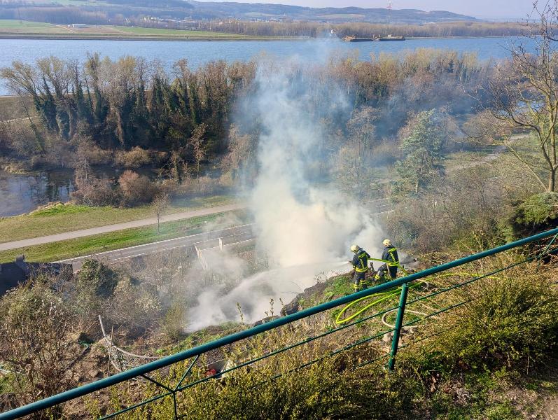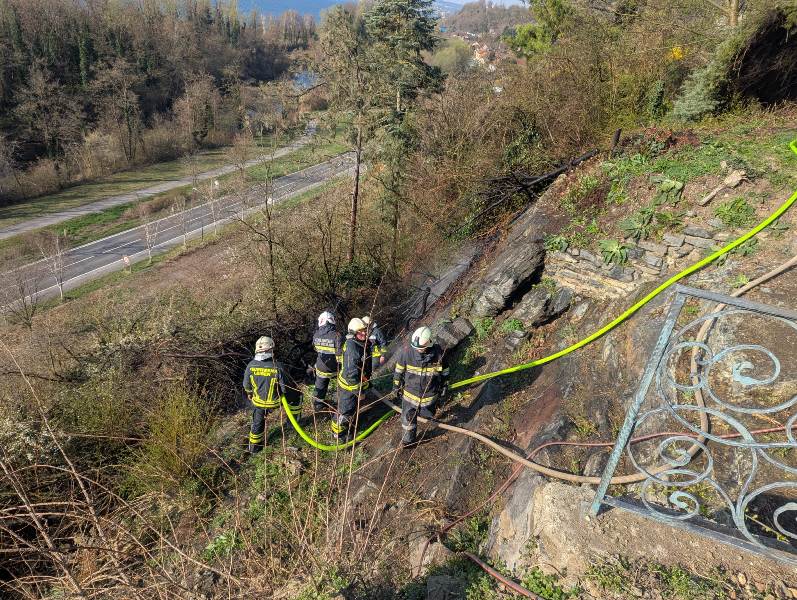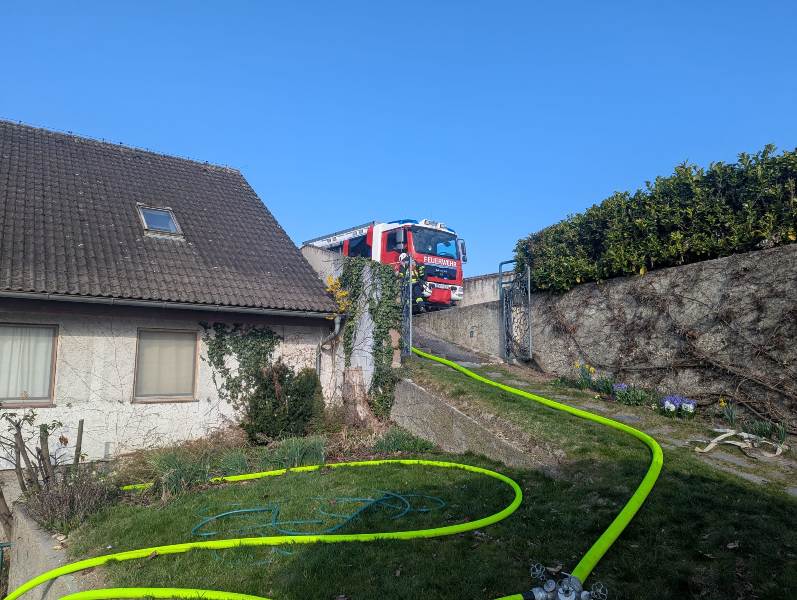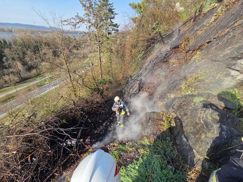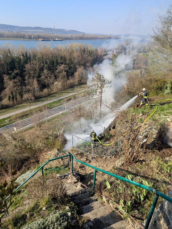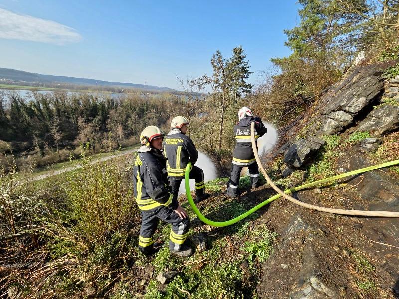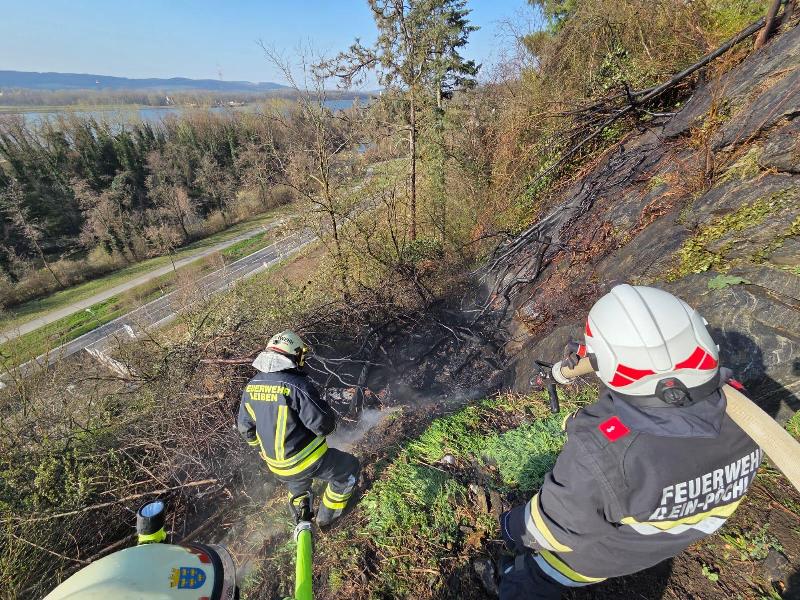 Am Montag, dem 23. März 2026, wurden wir um 08:06 Uhr zu einem Vegetationsbrand der Alarmstufe B1 nach Lehen (Donaublick) alarmiert. Nach unserem Eintreffen am Einsatzort erfolgte die Einweisung durch die Polizei. Dabei wurde bekannt gegeben, dass neben dem Brand auch eine Person im angrenzenden Wohnhaus durch die Rauchentwicklung gefährdet war. Infolge dieser Lage wurde die Alarmstufe auf B2 erhöht. Unmittelbar darauf übernahm unser Feuerwehrsanitäter die Betreuung der betroffenen Person und versorgte diese bis zum Eintreffen des Rettungsdienstes. Parallel dazu wurde zur Brandbekämpfung eine Löschleitung mit zwei C-Rohren in das steile Gelände vorgenommen. Die Wasserversorgung konnte über einen nahegelegenen Hydranten sichergestellt werden. Seitens der Feuerwehr Lehen wurde zusätzlich eine zweite Löschleitung zum Schutz des Nachbargebäudes aufgebaut. Die nachalarmierten Feuerwehren Klein-Pöchlarn und Pöbring unterstützten die eingesetzten Kräfte sowohl bei der Brandbekämpfung als auch bei der Sicherstellung der Wasserversorgung. Auf Anordnung des Einsatzleiters wurde zudem die Drohnengruppe der Feuerwehr Melk nachalarmiert, um mögliche Glutnester aus der Luft zu lokalisieren. Nach Beendigung der Nachlöscharbeiten konnten wir nach rund 2,5 Stunden wieder in das Feuerwehrhaus einrücken. Im Anschluss wurden sämtliche eingesetzten Geräte und Schläuche gereinigt und wieder einsatzbereit gemacht.